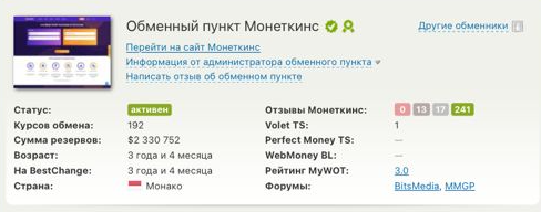 Разумеется, никакими документами «Монеткинс» не располагает. Зато сервис сотрудничает с крупными мониторингами обменников. К примеру, на платформе BestChange у сервиса хорошая репутация и высокий рейтинг. У криптообменника нет ни одной незавершенной финансовой претензии, мониторинг рекомендует пользоваться его услугами.