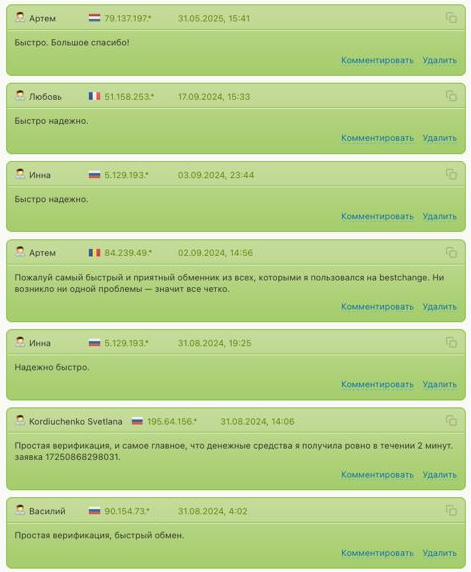 На сторонних площадках мнение о сервисе исключительно положительное. В основном клиенты пишут, что обмены проходят быстро и надежно. На BestChange за все время сервис собрал 241 положительный отклик. Можно с уверенностью заключить, что репутация у обменника хорошая.