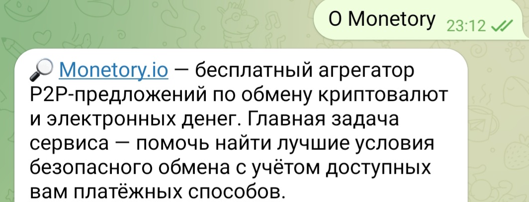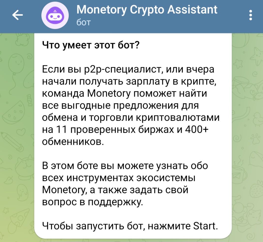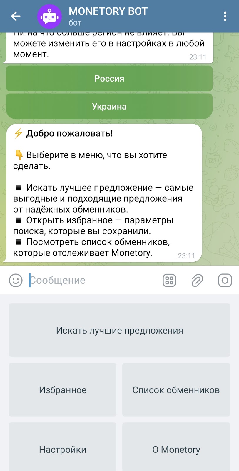 Также есть телеграм-бот для поиска лучших предложений по обмену — monetory bot. После активации программы нужно выбрать язык и страну. Далее откроется меню с 5 разделами: Искать лучшие предложения, Список обменников, О Монетори, Настройки и Избранное.