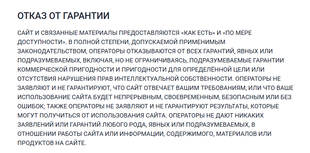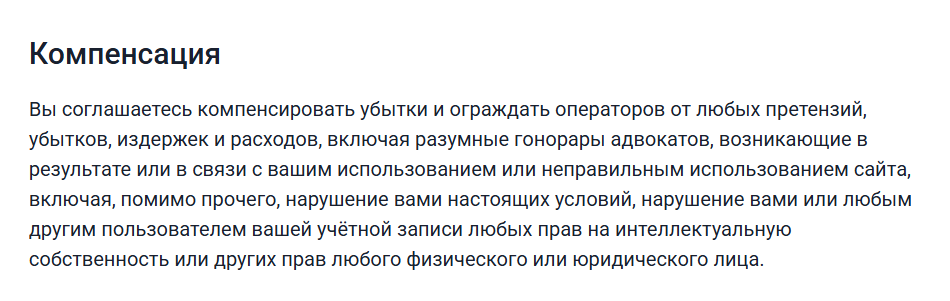 Анализ договора оферты показал, что представители агрегатора не несут ответственность и не дают никаких гарантий. Более того, обязывают пользователей компенсировать убытки сервиса.