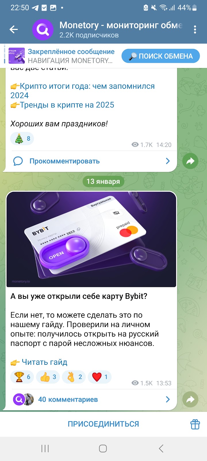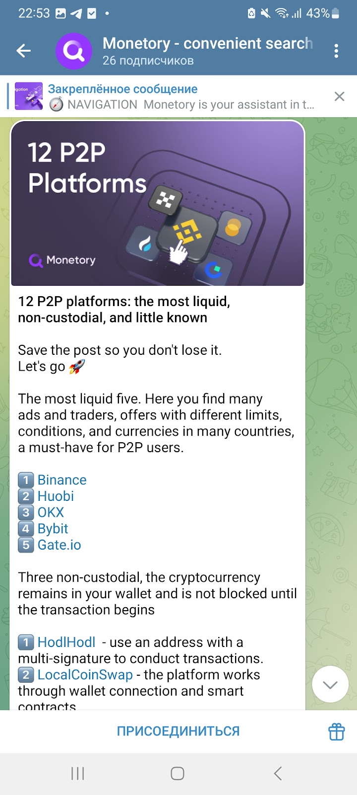 Монетори есть в разных соцсетях. Но активнее всего он продвигается через Телеграмм. Тут у проекта есть 2 страницы: monetory ru и monetory en для русскоязычных и англоязычных пользователей. В них публикуются новости из мира криптовалюты, обновления сайта-агрегатора. Проводится реклама разных обменников. Контент этих каналов идентичный. Комментарии оставлять можно. Но в обсуждении постов участвует около 2% аудитории.