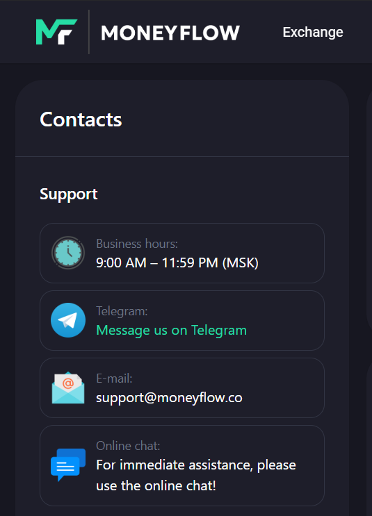 Money flow представляют как надежного партнера в области обмена криптовалюты и наличных денег. Он доступен на сайте moneyflow co. Ресурс ведется исключительно на английском языке.