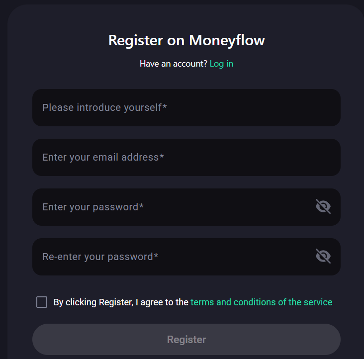 Для обмена валюты через Money flow нужно пройти регистрацию. В форме необходимо указать: