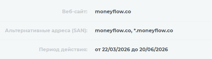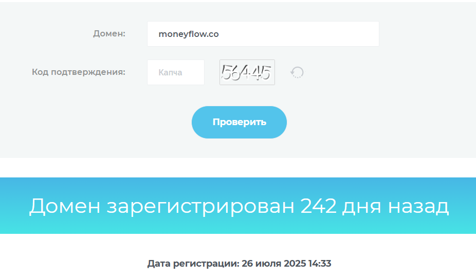 На сайте обменника не уточняется, кому именно он принадлежит и когда был создан. Но проверка показала, что домен moneyflow co был зарегистрирован 26 июля 2025 года.