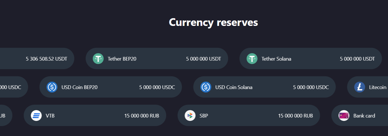 Обменник поддерживает биткоины, тезер, USDT и другие популярные криптомонеты. На сайте приводится резерв для каждого вида токена. Это помогает оценить доступную ликвидность и понять, сможет ли сервис обработать нужную сумму.