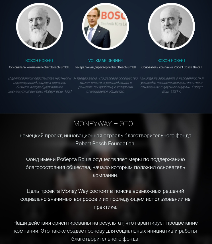С сайта сохранилось лишь несколько скриншотов, но даже по ним можно понять, что перед нами. Основателем корпорации тут открыто называют немецкого инженера и изобретателя Роберта Боша. На платформе даже приведены цитаты данной личности. Вот только он погиб еще в 1942-м году. Никакого отношения к фирме он просто не может иметь.