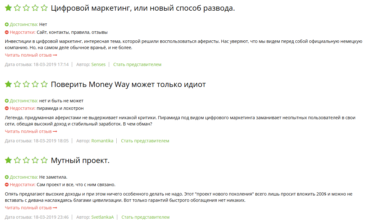 В интернете сохранилось несколько довольно подробных отзывов о Money Way. Посыл всех комментариев заключается в том, что это лохотрон. Люди указывают на все проблемы ресурса и утверждают, что в лучшем случае ресурс может сделать несколько выплат, но затем закроется как любая пирамида. Кажется, это уже произошло.