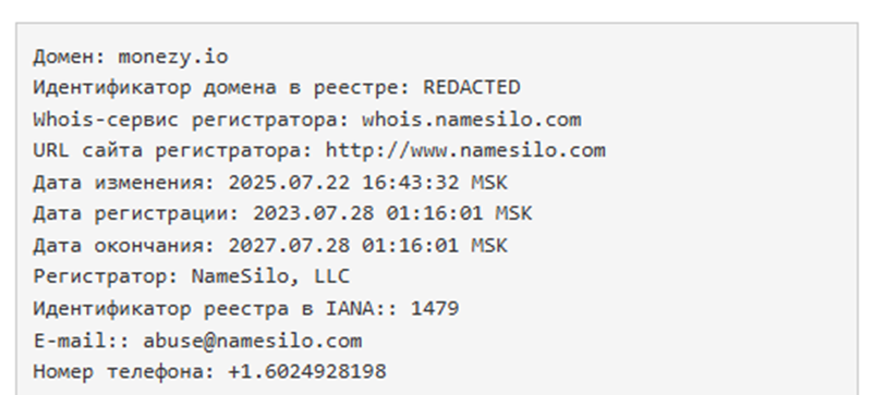 Дата регистрации домена Monezy Io указана 22 июля 2023 года. При этом, в веб-архиве первая версия сайта от 19 сентября 2025 года. Вероятно, был приобретен давно стоявший на продаже не востребованный адрес интернет-ресурса для создания иллюзии сформированной репутации.