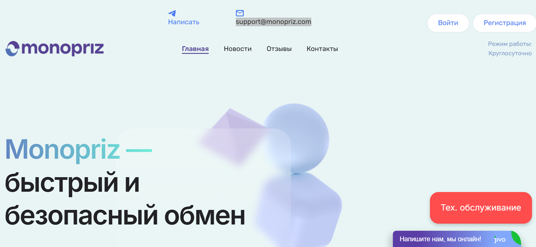 На официальном сайте Monopriz com представлено более 10 наиболее популярных валютных пар. Указано, что среднее время обмена составляет 15 минут. Для проведения транзакций нужно зарегистрироваться на сайте. Без этого невозможно даже узнать направления обмена и курс валют. На главной странице отсутствует такая информация.