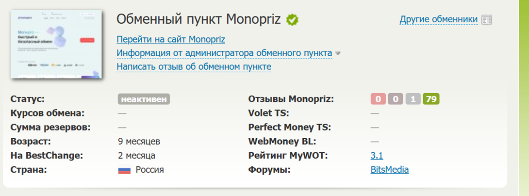Обменник Monopriz указывает партнером агрегатор сервисов Bestchange. На сайте сервиса также есть упоминание о платформе. Ссылка и описание совпадают с данной площадкой. Она внесена в реестр 2 месяца назад.