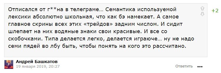 Отдельное сообщество в Телеграм канале представляет возможность ознакомиться с текстовыми и видео комментариями, якобы, довольных подписчиков закрытой группы. Они благодарят Майка за его профессионализм в трейдинге. Поискав аналогичные комментарии на тематических сайтах и форумах, мы встретили больше негативных оценок в сторону проекта.