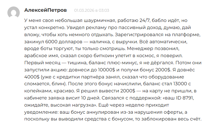 Интереснее сама схема работы. По оферте пользователям могут заблокировать аккаунт в любой момент. Вообще без объяснения причин. Один из клиентов сказал, что он хотел вывести средства с бонусами (при пополнении баланса на $10 000, начисляют $ 2000 в подарок), что запрещено.