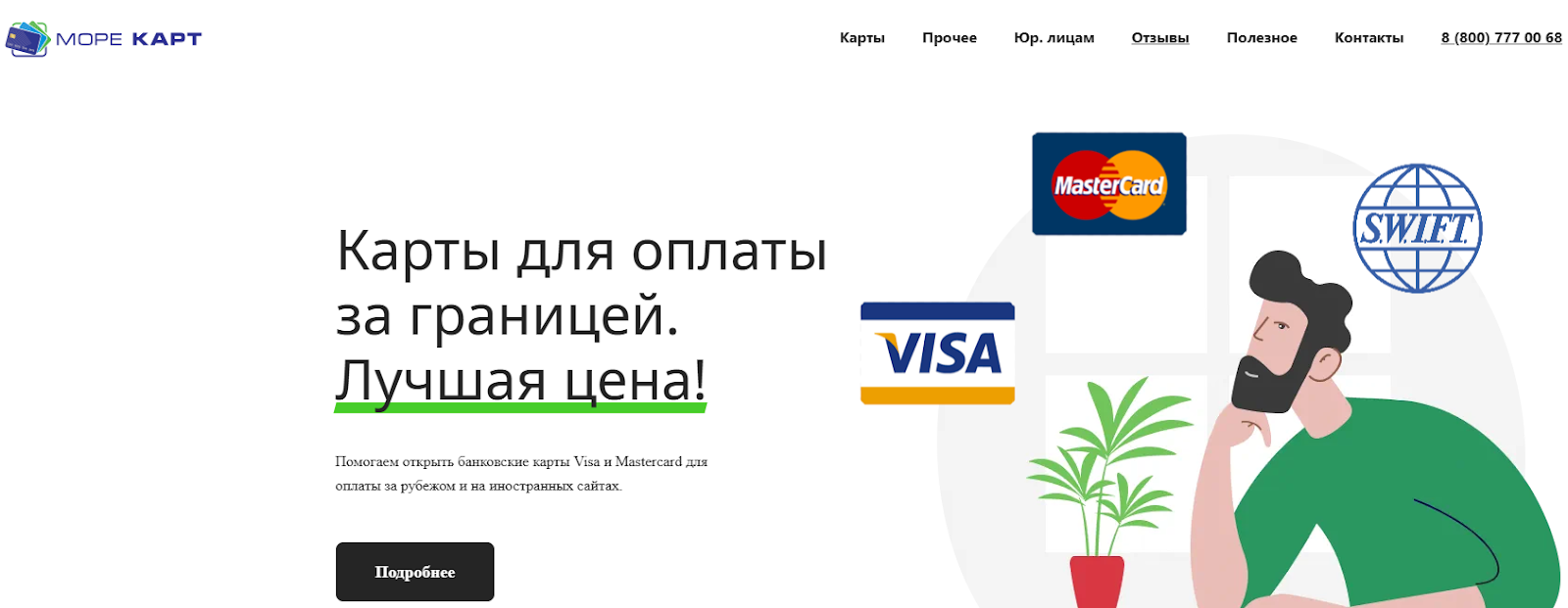 Сервис Море Карт отзывы от пользователей получил позитивные. Это сервис, который предлагает удаленное оформление банковских карт. Основная целевая аудитория – клиенты из России. Компания предлагает большой перечень стран. Оформление Visa и MasterCard происходит без поездок за границу. Клиентам обещают услуги «под ключ». Мы проверим предложения на сайте morekart ru и оценим отзывы пользователей.