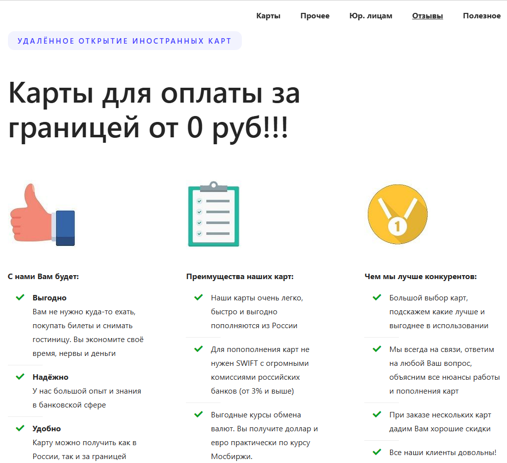Проект специализируется на посреднических услугах по выпуску иностранных банковских карт. По информации сайта, компания помогает оформить карты банков из разных стран и предоставляет консультации по их использованию.