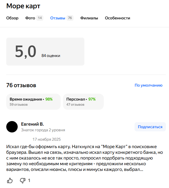• есть позитивные отзывы клиентов сервиса Море Карт;