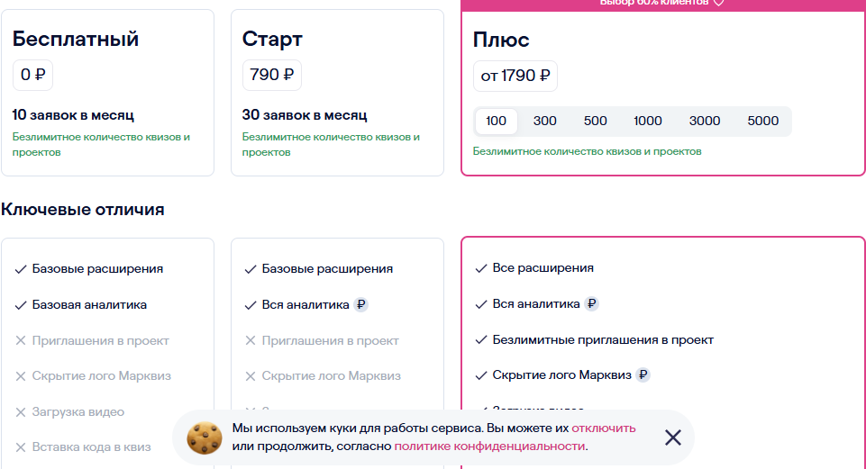3. Тариф Плюс (от 1790 руб.): 100–5000 заявок, расширенная аналитика, скрытие логотипа Marquiz, загрузка видео, экспорт данных, собственный домен, приглашения в проект.