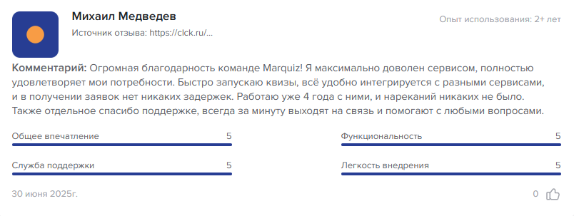 Пользовательские мнения разделились. Клиенты отмечают удобство конструктора, стабильную работу сервиса и возможность увеличения конверсии за счет диалогового формата. Есть отзывы, в которых Marquiz называют основным инструментом тестирования маркетинговых гипотез. Сервис демонстрирует высокую результативность при небольших вложениях.