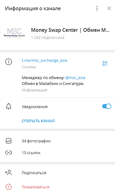 Продвигает услуги и ищет клиентов обменник через ТГ канал «Money Swap Center Обмен Малайзия Сингапур Тайланд Китай Бали Вьетнам». К своим преимуществам сервис относит выгодные курсы, быструю обработку сделок и персональные предложения. На канале говорится, что сервис работает напрямую с крупными поставщиками ликвидности и банками-партнерами. Но никаких подтверждений этому нет.