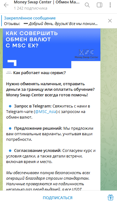 MSC Exchange ориентирован на пользователей, которым требуется обмен криптовалют в крупном объеме, включая международные переводы и сделки с наличными в некоторых странах Азии. Он позиционирует себя как участника глобального рынка, предлагает некоторым категориям клиентов индивидуальные условия. На самом канале не говорится, каких клиентов администрация имеет ввиду.