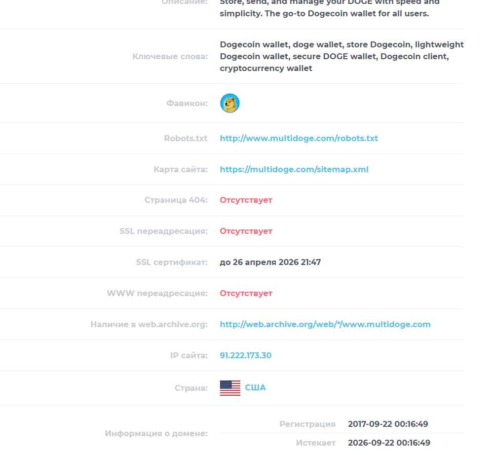 Домен Multidoge com был создан в 2017 году, спустя год после последнего обновления. Это одностраничник с общей информацией, который помогает только скачать клиент.