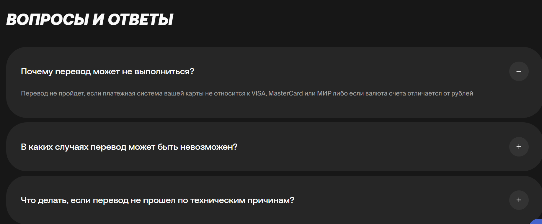 Блок часто задаваемых вопросов и ответов на них скуден и не содержит действительно полезных советов типа “как ускорить возврат средств с Мультитрансфера”.