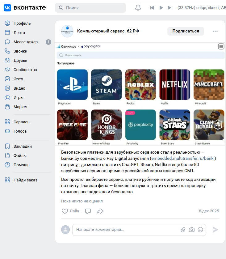 Из внешних упоминаний обнаруживается публикация во ВКонтакте о запуске витрины для зарубежных сервисов совместно с Банки.ру и Pay Digital. Прямого официального X/Twitter-профиля бренда в открытой выдаче найти не удалось.
