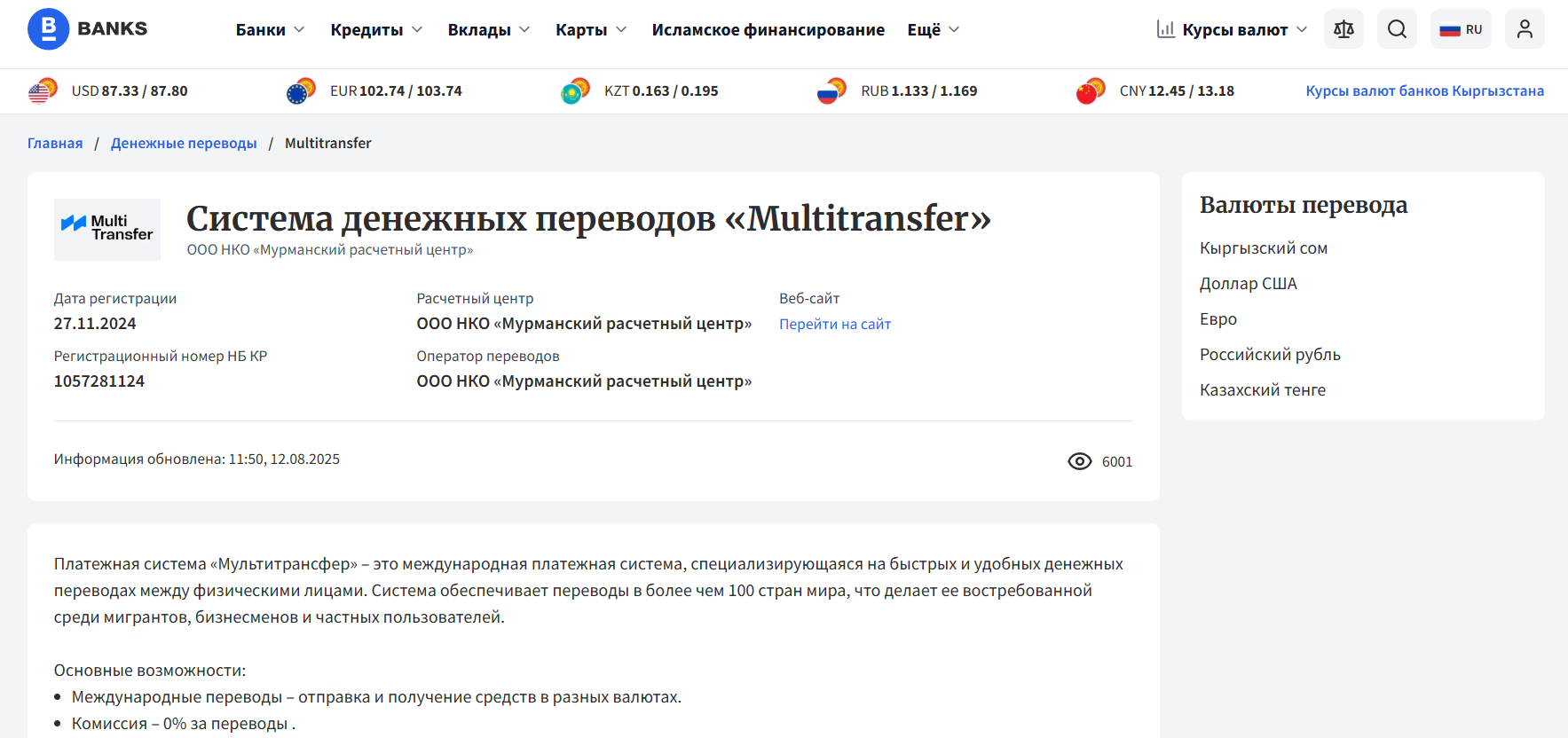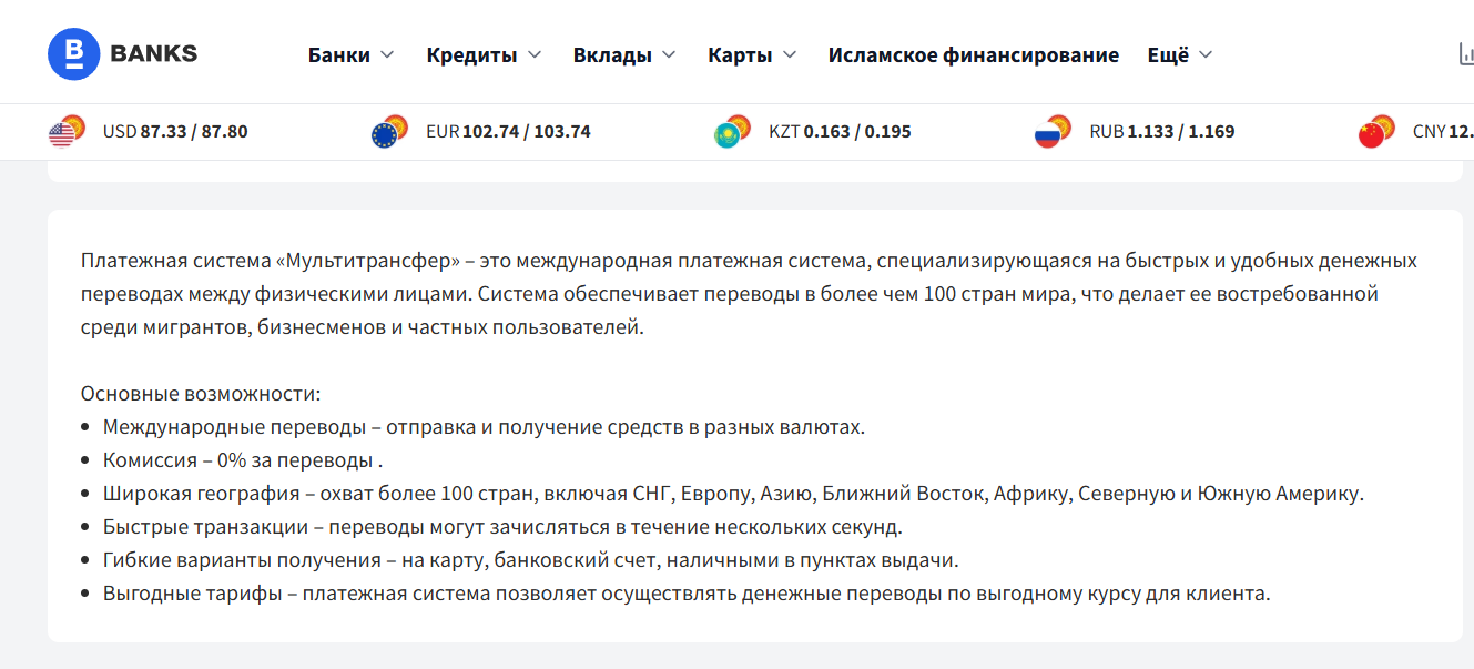 На агрегаторах банков сервис описан как добросовестный участник финансового рынка: более 100 стран, зачисление на карту, счет или выдача наличными, а в части направлений комиссия указана как 0,00%. Отзывов о Мультитрансвер Ру на таких ресурсах нет.