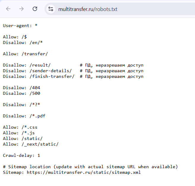 В Robots Txt домена указаны закрытые для индексации разделы, связанные с деталями сделок и картой сайта. Видно, что ресурс структурирован как рабочее приложение, а не просто лендинг. Это плюс и одновременно еще один негативный сигнал: ключевые пользовательские этапы перевода скрыты от внешнего просмотра, поэтому аудит приходится собирать по косвенным страницам и документам.