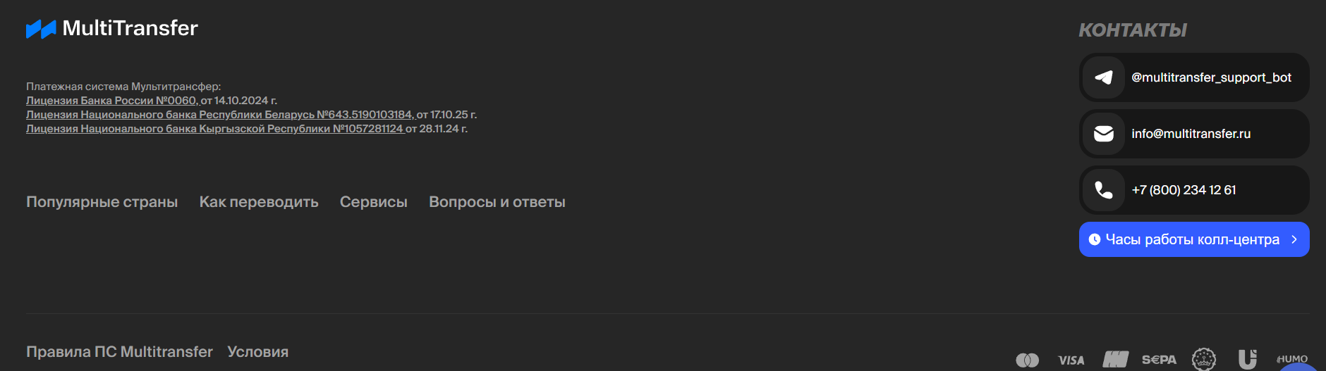 На одной из страниц сервиса опубликованы адрес e-mail Info Multitransfer Ru и Telegram-аккаунт Multitransfer Support Bot, причем обращения, отправленные в субботу и воскресенье, сервис обещает обработать в первый рабочий день недели. Поддержка существует, но моментальная доступность не гарантируется, и это важно для тех, кто пытается вернуть деньги по спорной операции.