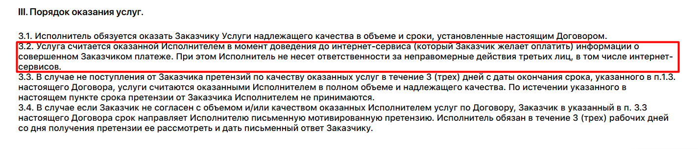 В оферте партнерской витрины с агрегатора фин. организаций предмет договора описан не как банковский перевод в чистом виде, а как информационно-технологическое обеспечение расчетов при подключении к интернет-сервисам.В другом разделе оферты говорится, что услуга считается оказанной в момент доведения до интернет-сервиса информации о совершенном платеже, а исполнитель не несет ответственности за неправомерные действия третьих лиц, включая сами интернет-сервисы. Для пользователя разница существенная: платеж проведен — это еще не тождественно спору, закрытому в его пользу.