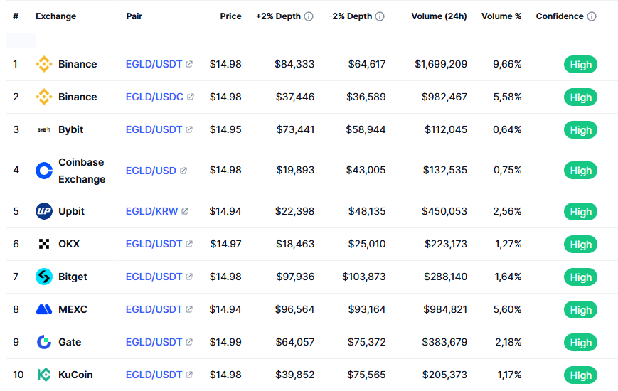 Торговля криптой EGLD доступна на Binance, HTX, MEXC. Объем на Binance – $1.6-1.7 миллиона в день. Ликвидность есть. Но она далека от пиковых времен.