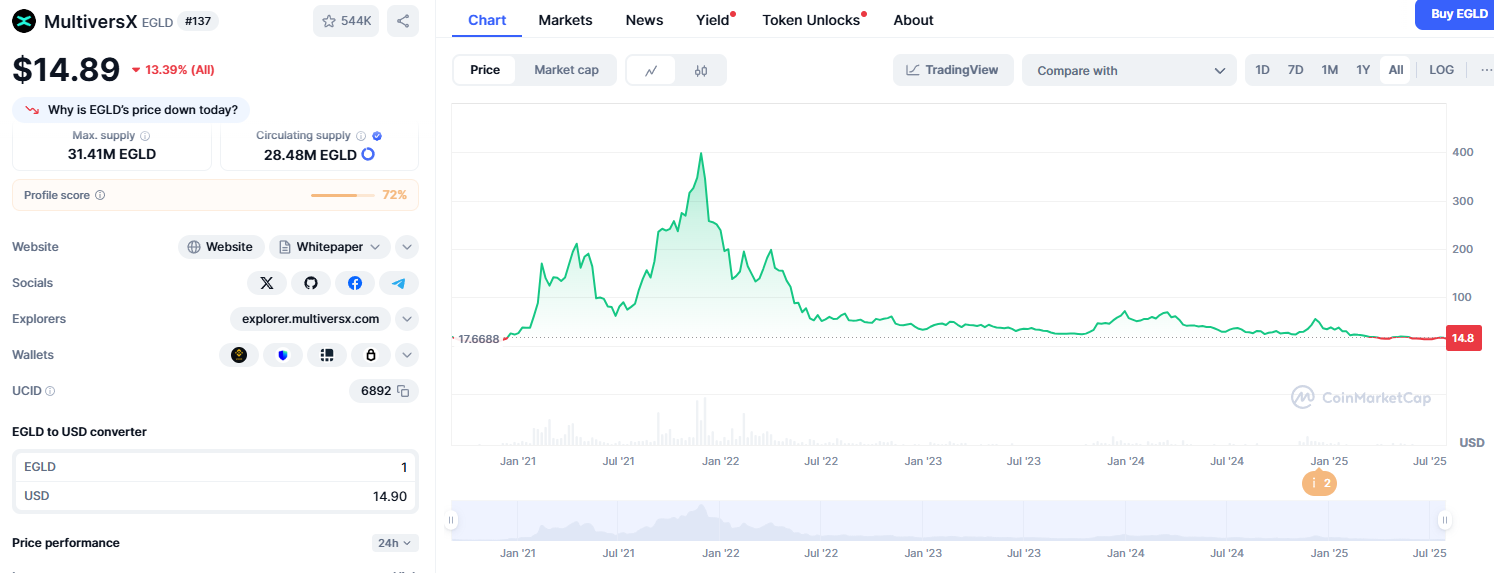 Но что случилось дальше. Токен рухнул до $14.98. Потеря 97% стоимости. Сообщество в панике, инвесторы в шоке. Ребрендинг с Elrond на MultiversX не спас ситуацию, а только ухудшил ее. Мы решили разобраться, стоит ли инвестировать в эту крипту.