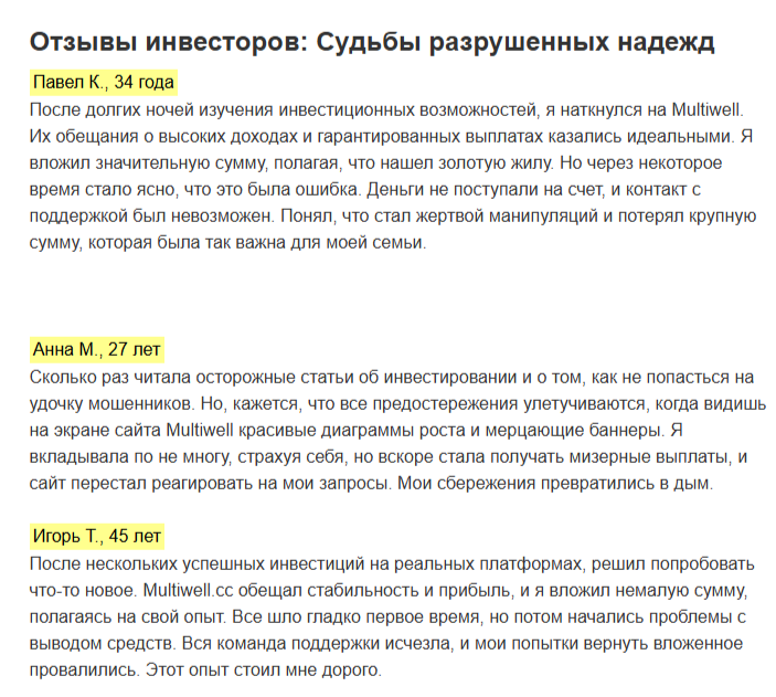 За короткую жизнь мошенническая платформа не получила положительных комментариев в свой адрес. Мы не нашли в мировой паутине отзывов о проекте Multiwell, в которых были упомянуты выгодные инвестиционные счета, быстрые и крупные выплаты дивидендов.