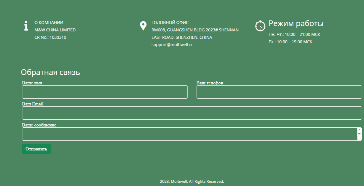 В процессе проверки платформы для инвестиций мы обнаружили, домен multiwell cc был зарегистрирован в начале 2023 года. Осенью того же года инвестиционная компания на данном портале прекратила свою деятельность. Упомянутый портал не принадлежал организации из Гонконга. Она вела свою деятельность на сайте multiwell net. Аферисты позаимстовали название и реквизиты в реальности существующей фирмы.