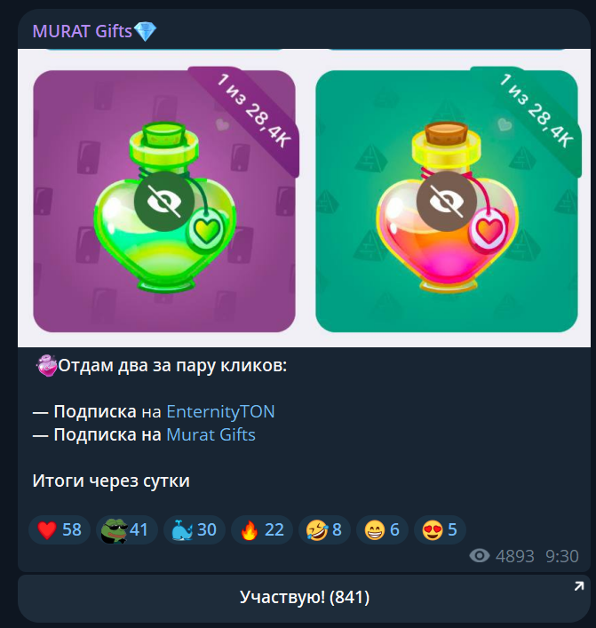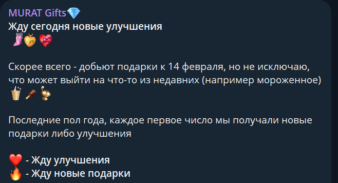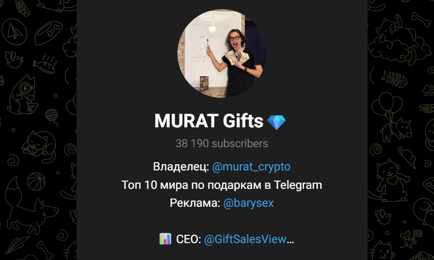 Телеграм-канал Murat NFT во многом вызывает подозрения. Здесь встречается информация о гарантах для покупки и продажи изображений, проводится аналитика рынка, пусть и не глубокая, а также появляется большое количество рекламы. Какой-то одной цели, которую бы заявил автор канала Fraud gifts, здесь нет. Все ведется в формате блога, без регулярных тематических публикаций, обсуждаются вопросы с аудиторией. При этом представлено большое количество идентификаторов, без какой-либо видимой для этого причины, а также тут множество подписчиков, набирающихся скачкообразно.