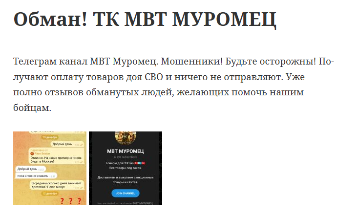«МВТ Муромец» – телеграмм-канал, отзывы имеющий в основном отрицательные. Проект является магазином, который предлагает подписчикам заработать на перепродаже товаров военного назначения. Заявлено, что автор канала живет в Китае и имеет выход на местные заводы, это якобы помогает ему находить товары дешевле.