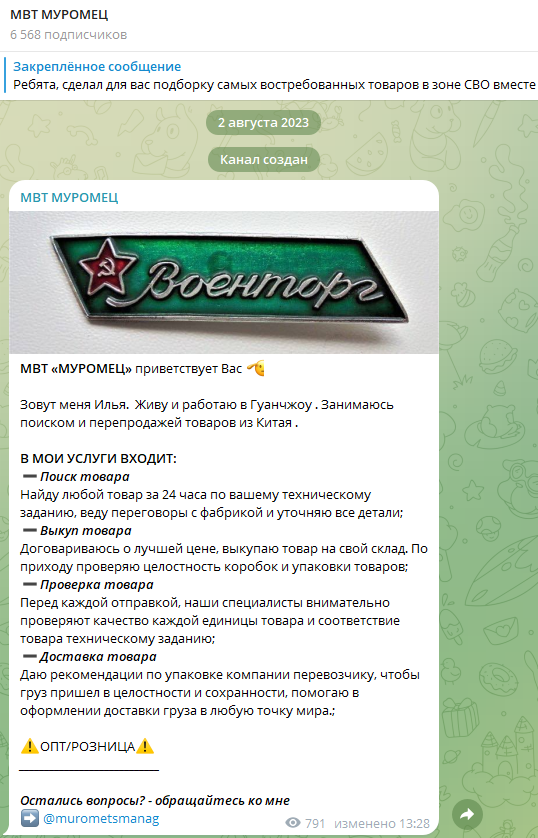 Канал «МВТ Муромец» был создан 2 августа 2023 года, его название за этот период было изменено несколько раз – в первом посте указано, что проект принадлежит некому Илье из Гуанчжоу, больше никакой информации о владельце нет. В ноябре 2025 года на ресурс подписано 6 568 человек, что впечатляющий показатель для сообщества, которое сосредоточено на перепродаже товаров.