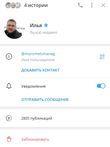Создателем канала является некий Илья, о нем нет никаких данных – только контакт @murometsmanag. На странице нет описания, загружена всего одна фотография, а истории посвящены товарам.