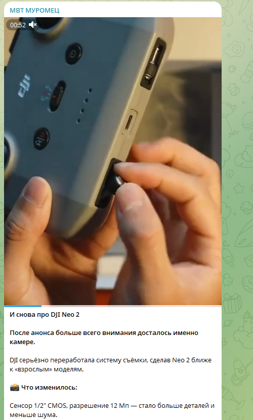 На канале «MVT Муромец» можно найти обзоры на товары и информационный контент – например, фотографии с завода-изготовителя дронов. При этом нет гарантий, что это авторские публикации, а не материалы, взятые из открытых интернет-источников.