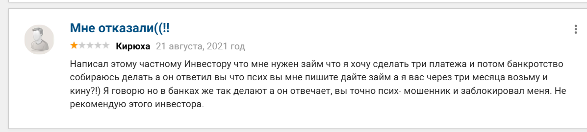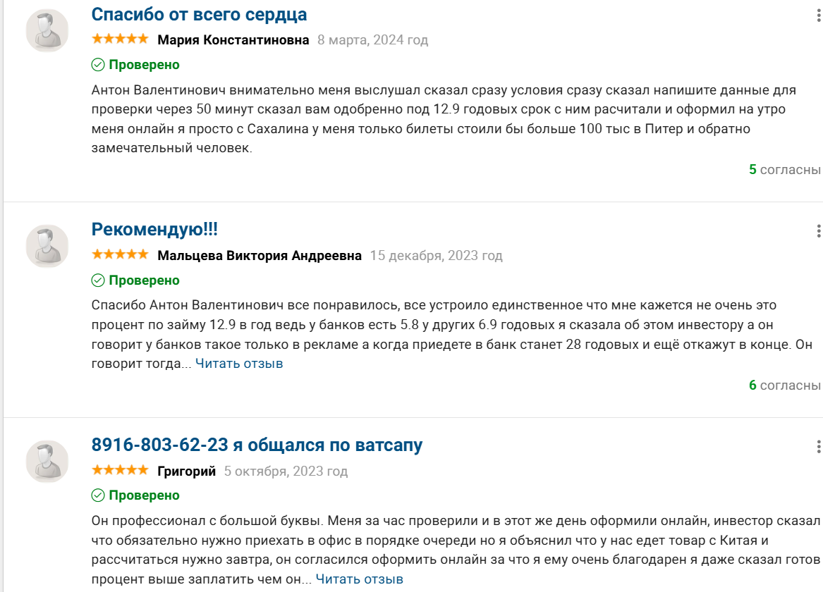 Стоит понимать, что вся информация об инвесторе в открытом доступе держится в основном на отзывах людей. Подробных официальных данных о нем нет: ни публичных регистраций в реестрах МФО, ни сайта с юридической информацией, ни публичной отчетности. Все представления о работе инвестора формируются из рассказов тех, кто уже брал у него деньги или пытался это сделать.