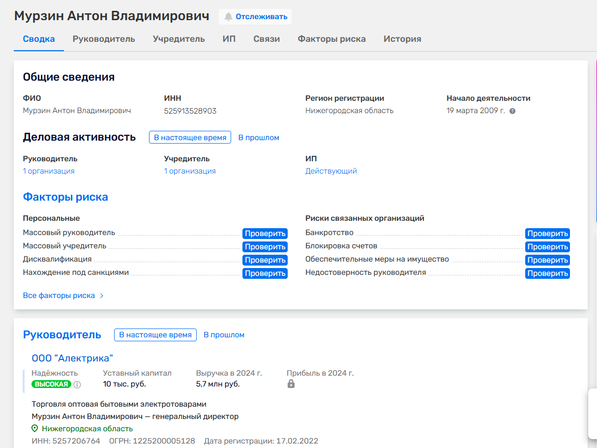 - Нет публично подтвержденного ИНН и юридического статуса, в реестрах нет записи о нем как об ИП или организации, что делает информацию о нем неполной и не дает возможности официально проверить кредитора.