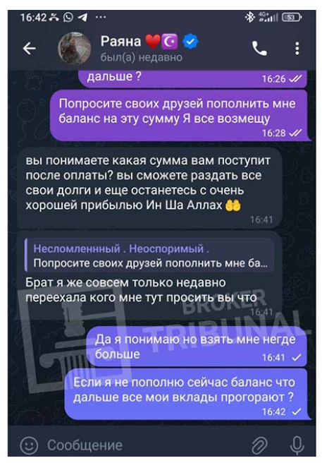 В рамках ТГ-канала Раяна предлагала воспользоваться раскруткой счета. Она заявляла, что может заработать каждому соотечественнику. Суть услуги в том, что приверженцам ислама доступны далеко не все методы инвестиций. Раяна заявляла, что сотрудничество с ней не противоречит нормам Корана.