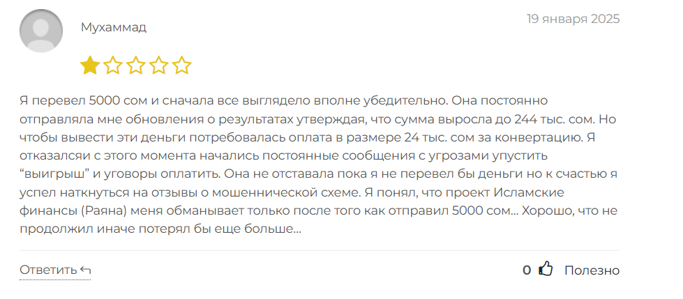 Раяна Мусаева – это инвестор, предлагающий свои услуги для граждан Кыргызстана. Изначально она вела телеграмм-канал «Исламские финансы». На него было подписано больше 10 000 человек, но сейчас этот ресурс удален из сети. Найти канал можно было по имени пользователя @guzal_kg.