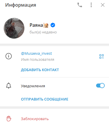 В сентябре 2025 года с Раяной Мусаевой все еще можно связаться. Она продолжает работать через аккаунт @Musaeva_invest.