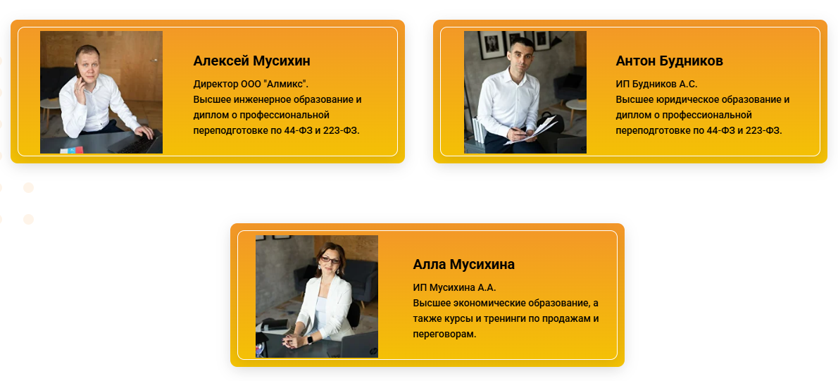 Далее нам чуть подробнее рассказывают о деятельности компании, но мы обратим внимание на юридическую часть. Дело в том, что их организация зачем-то поделена, по сути, на три: ООО “Алмикс”, ИП Буданов А.С. и ИП Мусихина А.А. Зачем подобное нужно – непонятно.