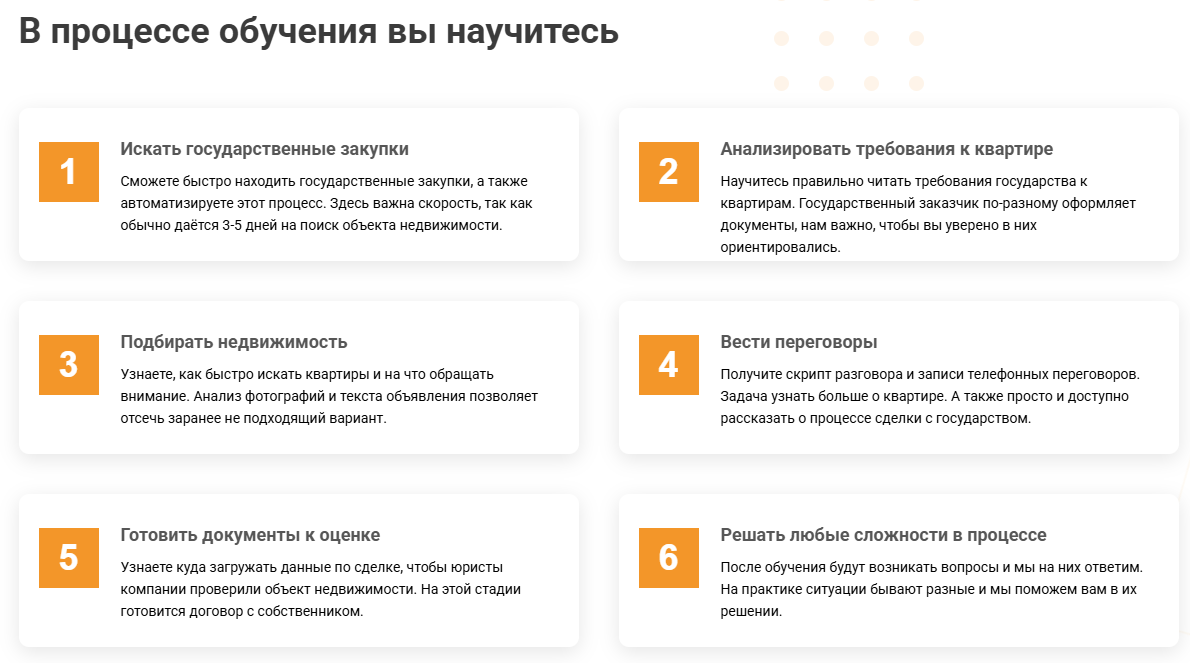 Описание курса ограничивается небольшим блоком, где пользователю рассказывают, чему он должен научиться. Среди навыков, которые можно будет приобрести: поиск госзакупок, анализ требований к квартире, подбор недвижимости, переговоры и подготовка документов.