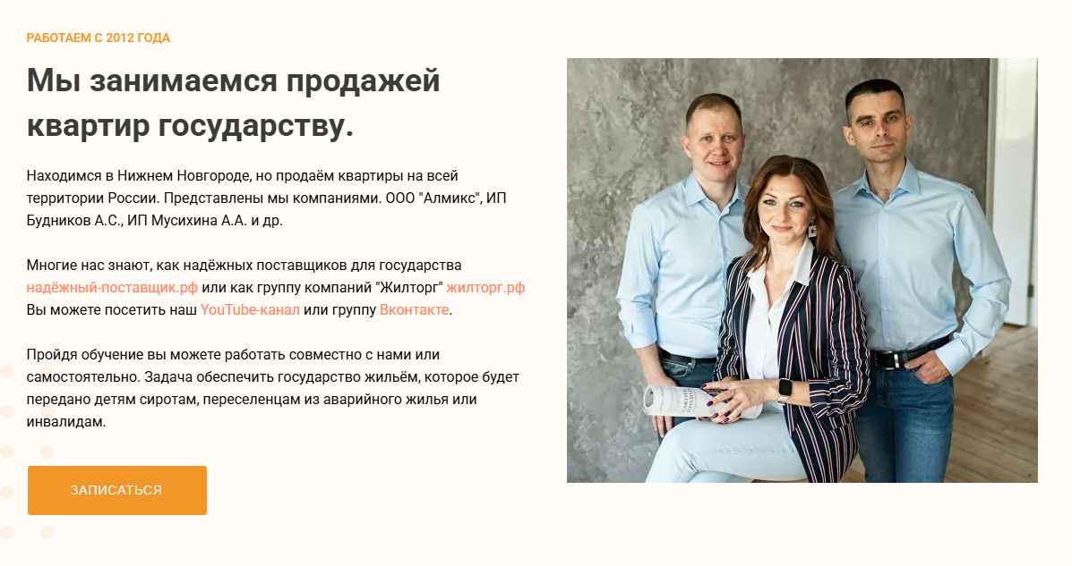Мусихин Алексей – это ментор, который со своей командой якобы уже несколько лет обучает тому, как продавать квартиры государству и зарабатывать на этом. О своих курсах автор рассказывает на собственном сайте, однако при изучении информации оттуда возникает немало сомнений. Далее в материале расскажем, что именно нас насторожило.