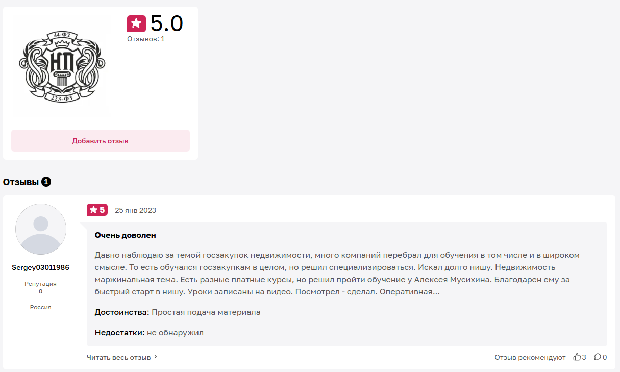В интернете мы не нашли отзывы, где люди бы писали, что обучение у Мусихина Алексея госзакупкам – это обман, лохотрон и т.п. В сети даже есть позитивные комментарии, вот только мы бы не рекомендовали опираться только на них. На одной из популярных платформ, например, нашлась всего одна рецензия, которая может быть фейковой.