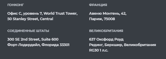 Компания также не предоставляет документов, дающих право на ведение финансовой деятельности на территории России. Нет ни лицензии от ЦБ РФ, ни каких-либо других бумаг от учреждений, занимающихся регулированием финансовой деятельности. Все это означает, что при возникновении проблем у резидентов РФ не будет возможности защитить свои права в суде.