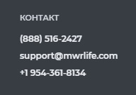 Для того, чтобы связаться со службой технической поддержки, нужно воспользоваться контактными данными, указанными внизу сайта. Обратную связь можно получить с помощью электронной почты support@mwrlife.com. Также с представителями компании можно связаться по телефону. Стоит отметить, что телефонные номера зарегистрированы за рубежом.